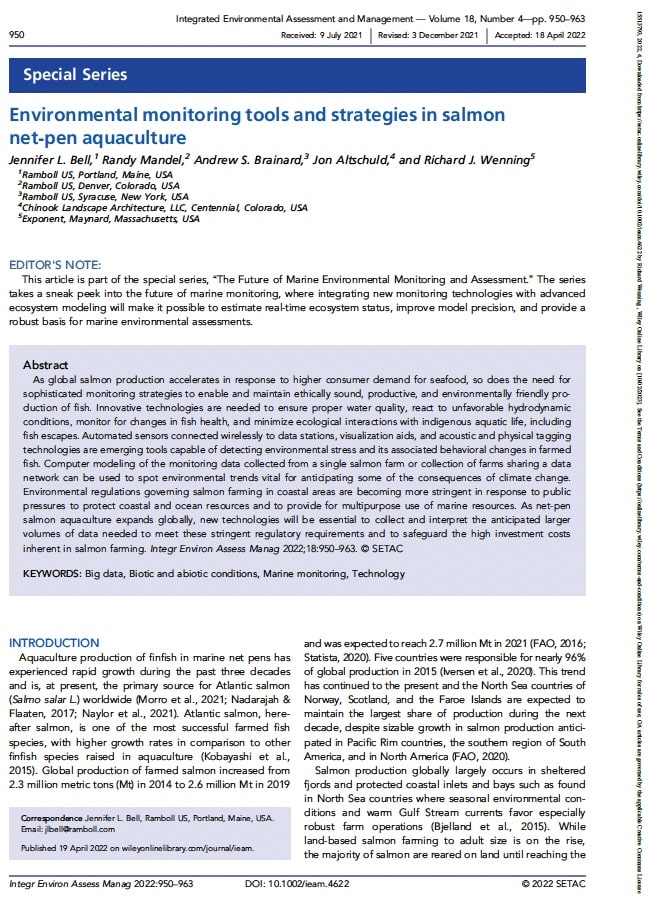 As global salmon production accelerates in response to higher consumer demand for seafood, so does the need for sophisticated monitoring strategies to enable and maintain ethically sound, productive, and environmentally friendly production of fish. Innovative technologies are needed to ensure proper water quality, react to unfavorable hydrodynamic conditions, monitor for changes in fish health, and minimize ecological interactions with indigenous aquatic life, including fish escapes. Automated sensors connected wirelessly to data stations, visualization aids, and acoustic and physical tagging technologies are emerging tools capable of detecting environmental stress and its associated behavioral changes in farmed fish. Computer modeling of monitoring data collected from a single salmon farm or from a collection of farms sharing a data network can be used to identify environmental trends vital for anticipating some of the consequences of climate change. Environmental regulations governing salmon farming in coastal areas are becoming more stringent in response to public pressure to protect coastal and ocean resources and to support the multipurpose use of marine resources. As net‐pen salmon aquaculture expands globally, new technologies will be essential for collecting and interpreting the anticipated larger volumes of data needed to meet stringent regulatory requirements and safeguard the high investment costs inherent in salmon farming.