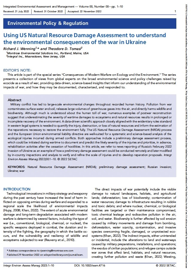 Military conflict has led to large‐scale environmental changes throughout recorded human history. Pollution from war contaminates surface water and soil, releases large volumes of greenhouse gases into the air, and directly harms wildlife and biodiversity. Although much is understood about the human toll of war, numerous examples of postwar reconstruction suggest that underestimating the severity of wartime damage to ecosystems and natural resources leads to prolonged or incomplete environmental recovery. A data‐driven scientific approach, closely aligned with the evidentiary rules standard in Western legal systems, is needed to quantify the injury, destruction, or loss of natural resources and to inform the estimation of the reparations necessary to fully restore the environment. The US Natural Resource Damage Assessment (NRDA) process and the European Union environmental liability directive (ELD) are well‐suited for a systematic and science‐based analysis of the ecological injuries incurred during armed conflicts. Both approaches include a preliminary damage assessment process that could be initiated during wartime to document and predict the likely severity of injuries and to prioritize rehabilitation activities in advance of the cessation of hostilities. In this article, we refer to news reporting of Russia’s February 2022 invasion of Ukraine as an example of how a preliminary damage assessment could be conducted remotely and later modified by in‐country inspections and analysis to verify and refine the scale of injuries and to develop reparation proposals.
